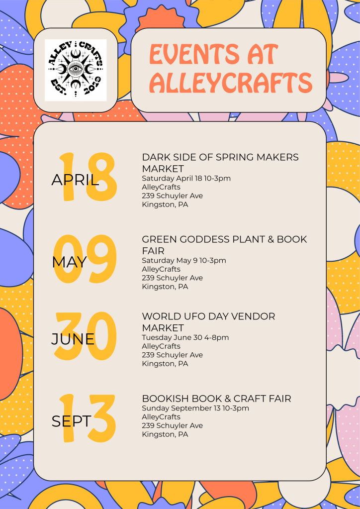 NEPA CraftWorks started hosting juried craft shows in 2017. Since then we started hosting themed events. Such as food festivals featuring the popular Pickle This Pickle That Festival. In 2025 book themed events joined the line-up at my shop, AlleyCrafts. 2026 will bring new venues and new food festivals held at the Luzerne County Fairgrounds. While these events are not your typical juried craft market, the events are still juried to provide thoughtfully curated makers at every show.